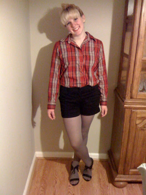 Today my goal was to wear something that accurately expressed who I am but that was also kid friendly. I needed to make sure I could run around and crawl on the floor in it! So I went with a comfortable plaid top and a shorts with tights combo. Wearing tights is a great way to wear sandles that you love in the wintery months. I went with this shoe because it had a slight wedge and I wanted to dress the outfit up a bit. I tied it all together with my gold magnifying glass necklace and red lipstick.